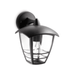 Aplique Creek Philips en color negro con casquillo E27 y diseño clásico compacto. Apto para bombillas hasta 60W y protección exterior IP44.