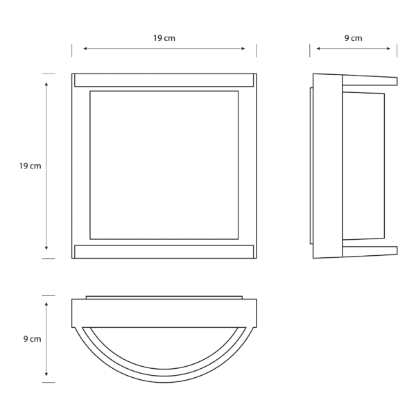 Fabricado en aluminio antracita y con protección IP44, soporta lluvia y humedad. Sus medidas de 19 × 8,9 × 19 cm permiten una instalación compacta y elegante en cualquier pared exterior.