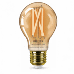 La bombilla Philips Smart LED WiZ A60 ofrece 640 lúmenes y un amplio rango de blanco regulable entre 2000K y 5000K. Su acabado ámbar aporta un toque decorativo ideal para lámparas visibles, creando ambientes cálidos o más funcionales según cada momento.